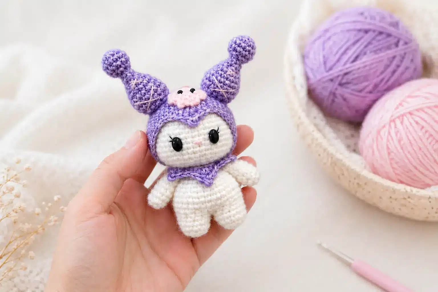 This Kuromi-Inspired Amigurumi Crochet Pattern is a cute project for anyone who loves kawaii crochet, small dolls, purple color palettes, and character-style amigurumi. The separate hood, ears, pom-poms, collar, and forehead applique make the pattern feel special while still staying manageable for an intermediate beginner.