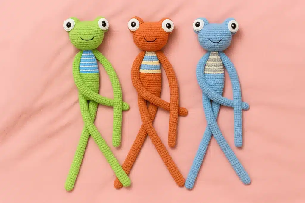 So, why has the crochet leggy frog become so popular? Simple. It’s beginner-friendly, endlessly customizable, and just plain fun. Whether you want a keychain-sized frog for your bag or a big plush buddy for the couch, this pattern adapts beautifully. Plus, with its striped shirt and goofy grin, this frog always manages to charm.