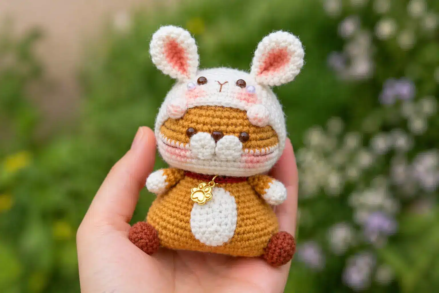 This sitting tiger in bunny hood crochet pattern is a sweet mix of cute animal amigurumi and costume-style crochet. The rounded tiger body, tiny paws, white belly patch, soft bunny hood, and long ears make it a charming project for gifts, craft fairs, keychains, or seasonal decorations.